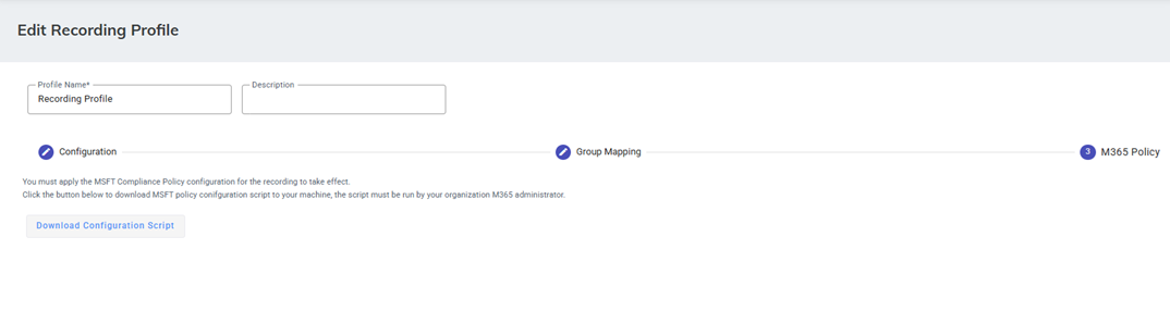 In the M365 Policy section, click Download Configuration Steps. Admins need to download and run the PowerShell script in the Azure environment to enable these settings. Once completed, the Recording Profile status will change to ‘Success’. This is a mandatory step. |