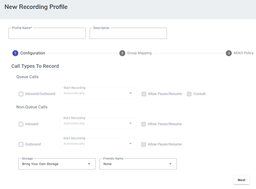 The procedure below describes how to add a Recording Profile. The Admin can configure which call types are recorded based on call direction. Calls are categorized as queued (routed to the agent through a call queue, also known as a Worker Queue) or non-queued (direct calls to the agent via the Worker App).