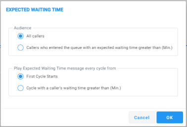 Cycle with a caller's waiting time greater than - prompt starts playing in the cycle that is equal to or greater than the time configured in this field |