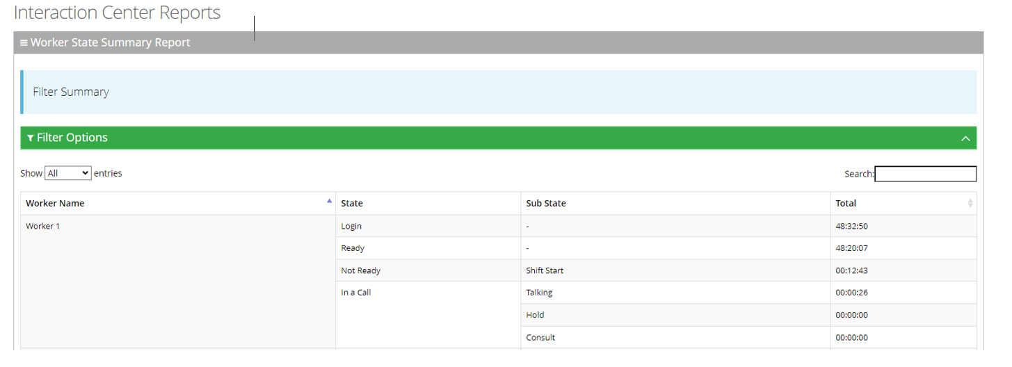 Open the Worker State Summary Report page (Reports > Interaction Center Reports > Voice Reports > Worker State Summary Report); the following appears: |
