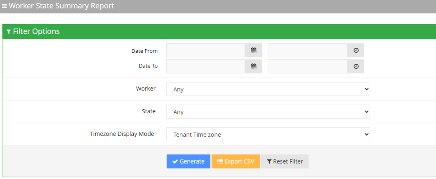 The Worker State Summary Report displays a summary of the time workers spend in various states. This report is divided by Worker’s names.