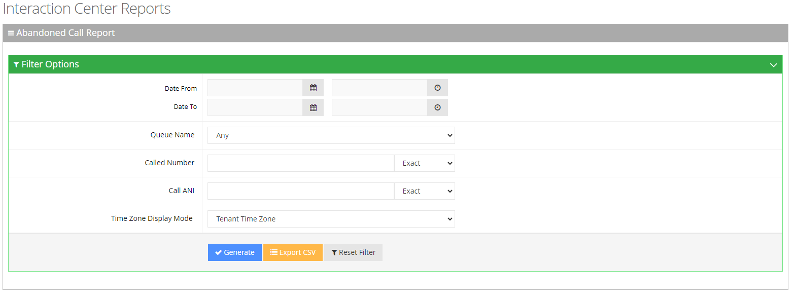 | 1. | Open the Abandoned Call Report page (Reports > Interaction Center Reports > Voice Reports > Abandoned Call Report); the following appears: |