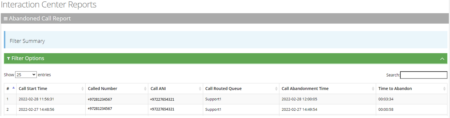 An Abandoned Call Report displays the actual information about calls that were abandoned.