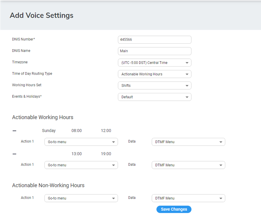 If you select Actionable working hours, calls are handled based on the working hours. When selecting this option, a Working Hours Set should be selected. All shifts defined in that set are displayed and for each working hour shift, relevant actions can be configured. Relevant actions can be also configured for non-working hours. |