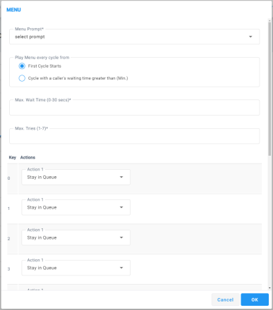 Cycle with a caller's waiting time greater than - menu's prompt starts playing in the cycle that is equal to or greater than the time configured in this field. |