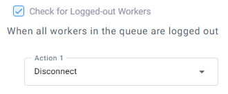 To configure an overflow action when all workers are logged out, select the 'Check for logged out Workers' check box, and then from the 'Action' drop-down list, select the action (Play Prompt, Go-to menu, Disconnect, Silent Transfer to Phone, Send SMS, Transfer to Queue, Go-to Flow, or Leave Message). |