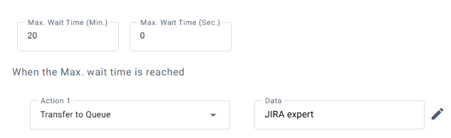 When the maximum waiting time has been reached, the caller is automatically transferred to the relevant action, which is configured in the 'When the maximum wait time is reached' field. For more information of possible actions, see Actions.