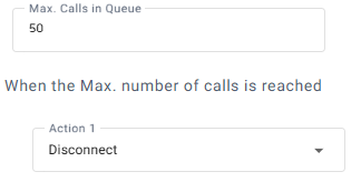 In the 'Max. Calls in Queue' field, enter the maximum number of calls that can wait in the queue (1 to 99). When the maximum number of calls has been reached, the caller is automatically transferred to the relevant action, which is configured in the 'When the maximum number of calls is reached' field. For more information of possible actions, see Actions. |