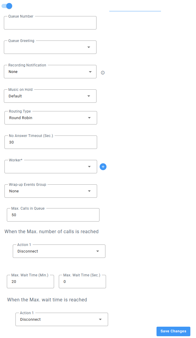 In the 'Max. Wait Time (Sec.)' field, enter the maximum time in seconds that a call can wait in the queue. |