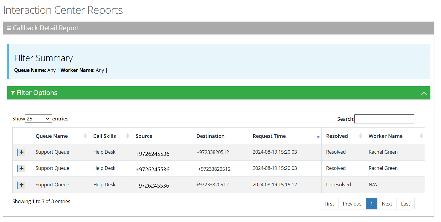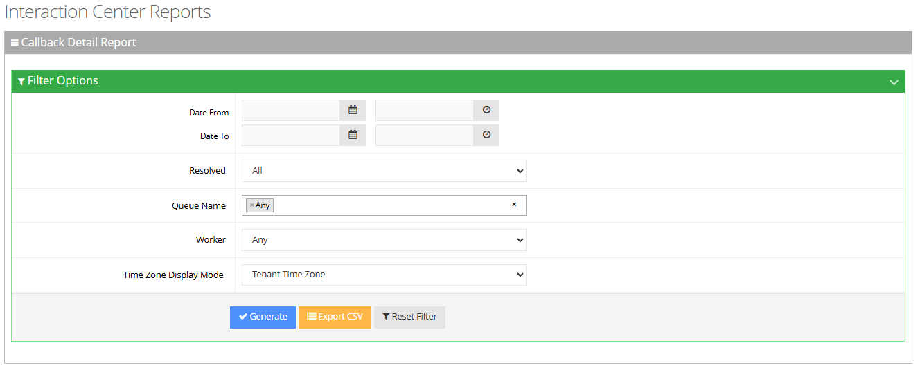 Open the Callback Detail Report page (Reports > Interaction Center Reports > Voice Reports > Callback Detail Report); the following appears: |