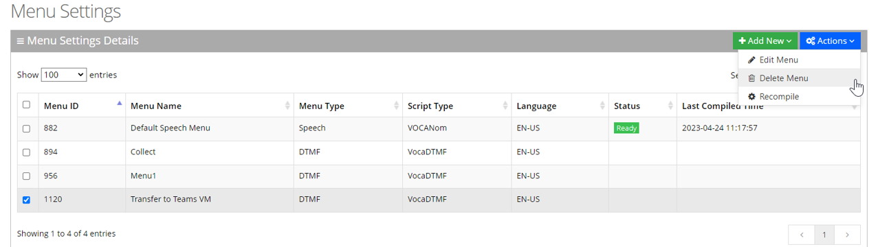 4. Select Delete Menu; the message "Are you sure you want to delete the selected menu?" appears.