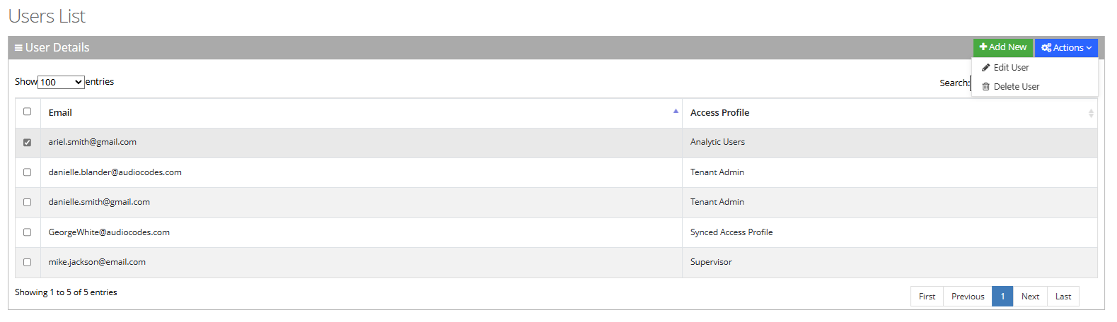 1. Open the User List page (Configuration > Access Management > Users List); the following appears: