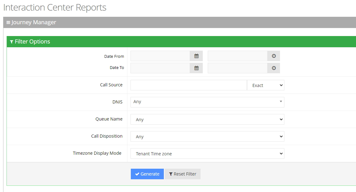 1. Open the Journey Manager Report page (Reports > Interaction Center Reports > Voice Reports > Journey Manager); the following appears:
