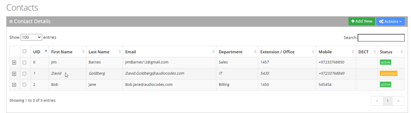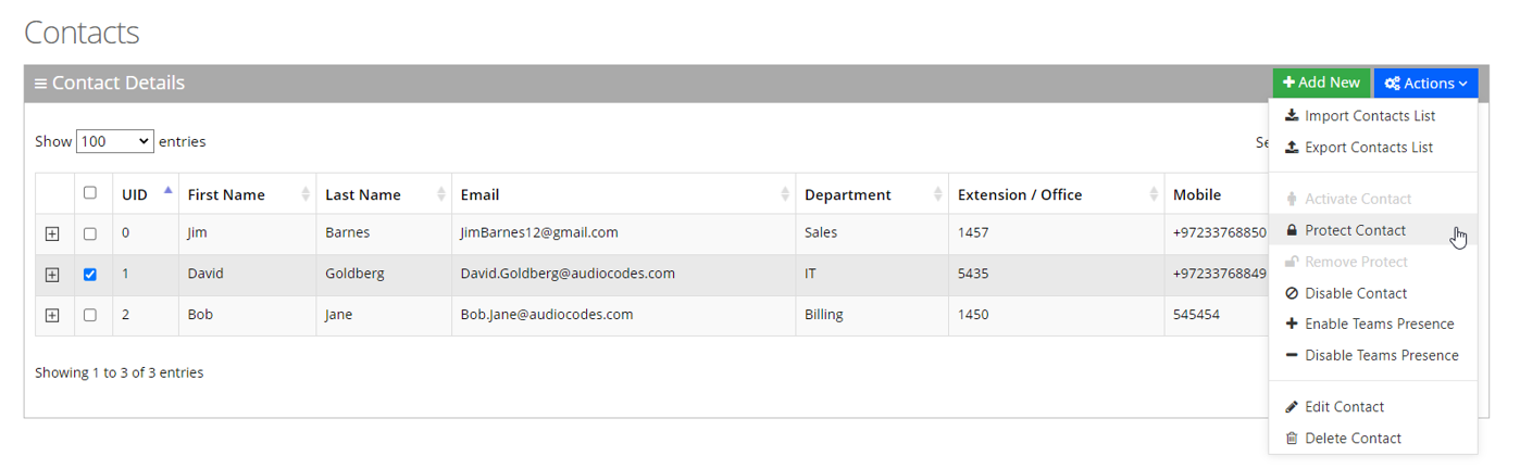 In most cases, the Contacts List is retrieved from an external source (e.g., Active Directory or a CSV file). Organization administrators have the option to change specific contact details and set the contact to Protect mode. By doing this, a re-synchronization of the Contacts List will not override the change.