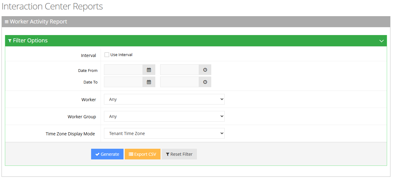 1. Open the Email Worker Activity Report page (Reports > Interaction Center Reports > Email Reports > Worker Activity Report); the following appears: