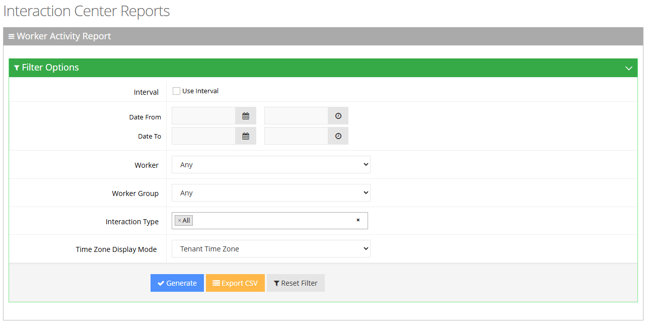| 1. | Open the Worker Activity Report page (Reports > Interaction Center Reports > Chat Reports > Worker Activity Report); the following appears: |