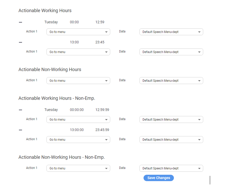 If you select Actionable working hours (Emp./Non-Emp): Calls are handled based on working hours and whether the caller is an employee or non-employee. When selecting this option, a 'Working Hours Set' option should be selected. All shifts defined in that set are displayed for employees and non-employees. For each working hour shift, relevant actions can be configured. Relevant actions can be also configured for non-working hours for employees and non-employees.