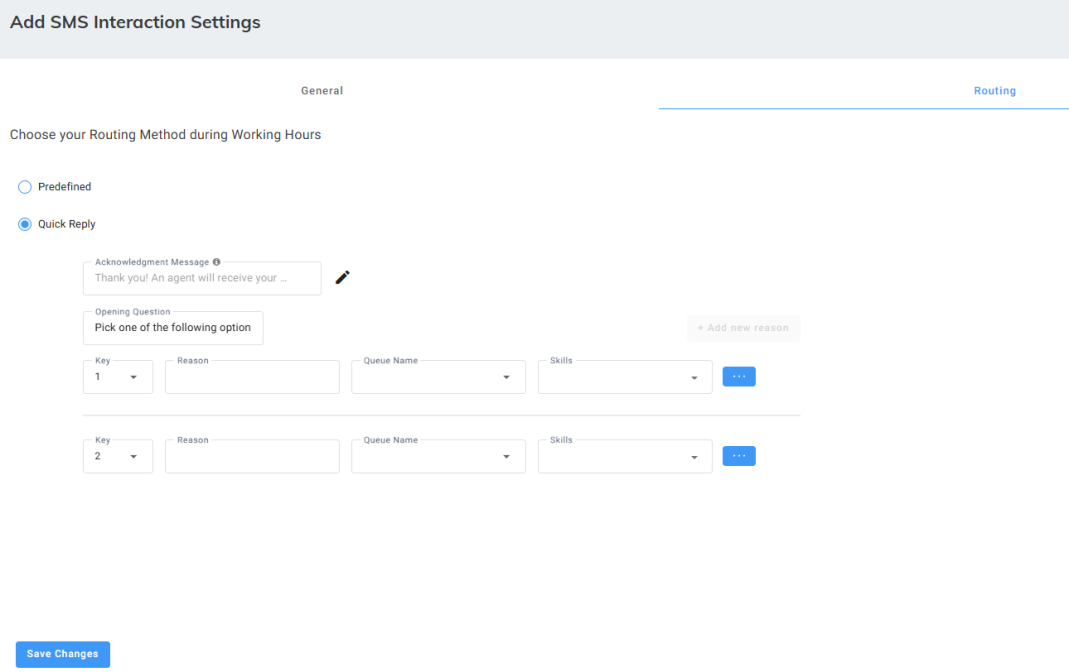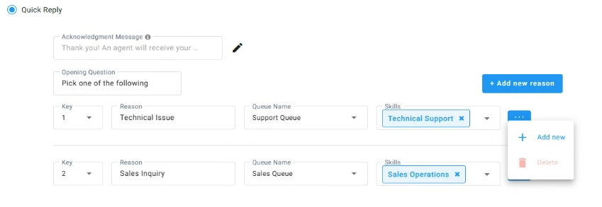 Quick Reply - Select this to create a tiered menu system. This allows customers to select their contact reason and any sub-reasons, and they will be routed to the appropriate queue.
