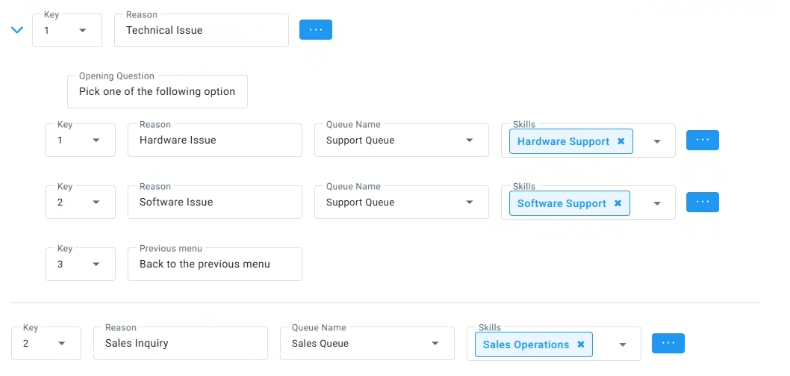 f. Add one or more sub-reasons that appear when the customer selects a specific option. For example, if they press 1, they will see another sub-menu with additional options to refine their contact reason: