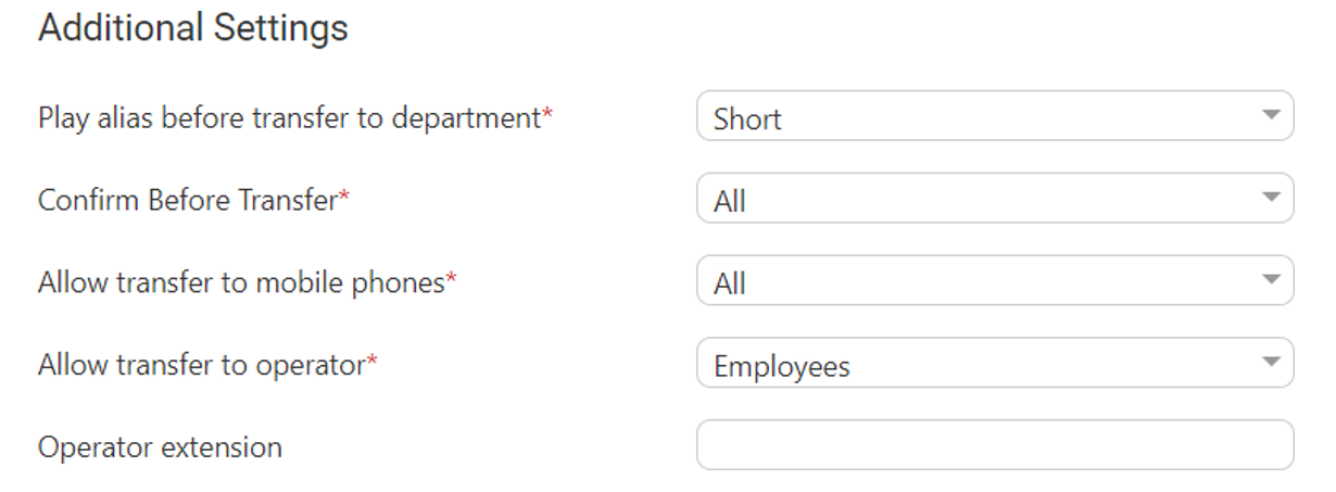 Disabled: Plays only the department name before the transfer. If there is disambiguation, only disambiguation options are played.