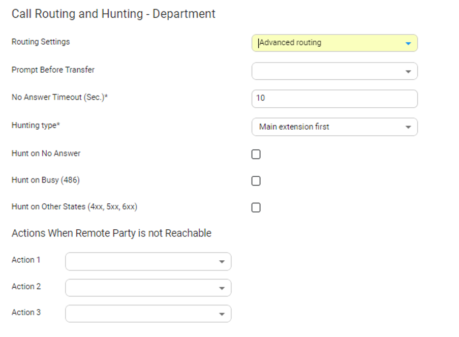 8. Under the Call Routing and Hunting - Department group and from the 'Routing Settings' drop-down list, select either: