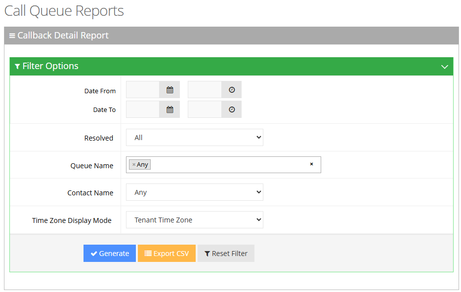 Open the Callback Detail Report page (Reports > Call Queue Reports > Callback Detail Report). |