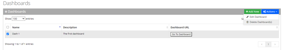 2. Select the dashboard you wish to delete by selecting the corresponding Dashboards check box.