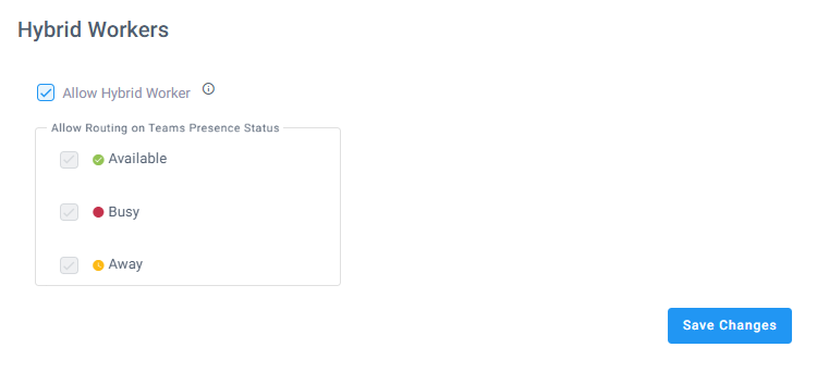 Under ‘Allow Routing on Teams Presence Status’, select the Workers’ presence status in Microsoft Teams that is considered ‘Ready’ to accept a call. |