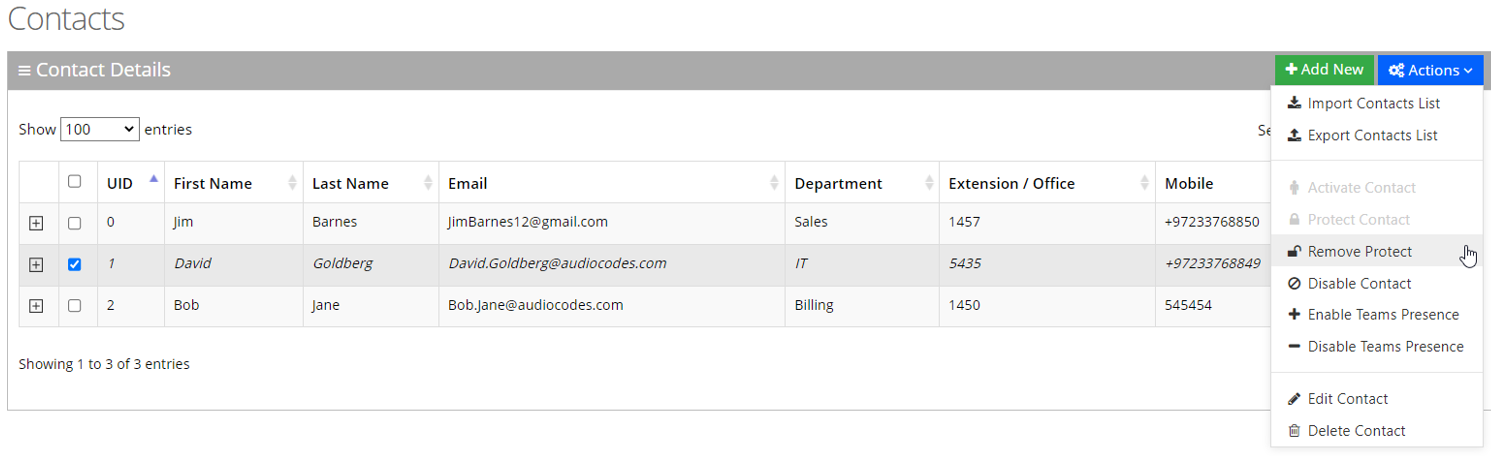 | 2. | Select the protected contact you wish to remove the "Protect" status, by selecting the 'Contact' check box. |