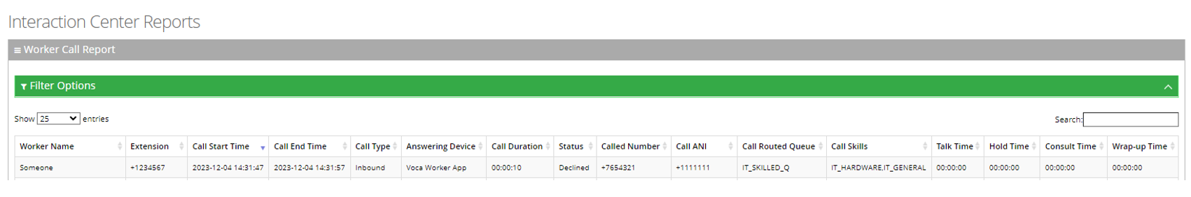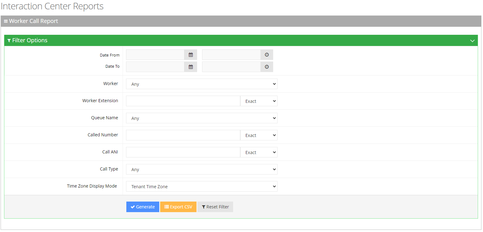 Open the Worker Call Report page (Reports > Interaction Center Reports > Voice Reports > Worker Call Report); the following appears: |