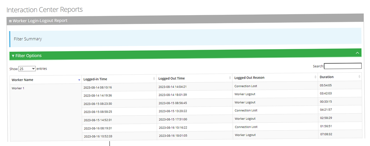 The Worker Login-Logout Report presents the workers’ Logged-in and Logged-out times. This report is separated by each Worker’s name.