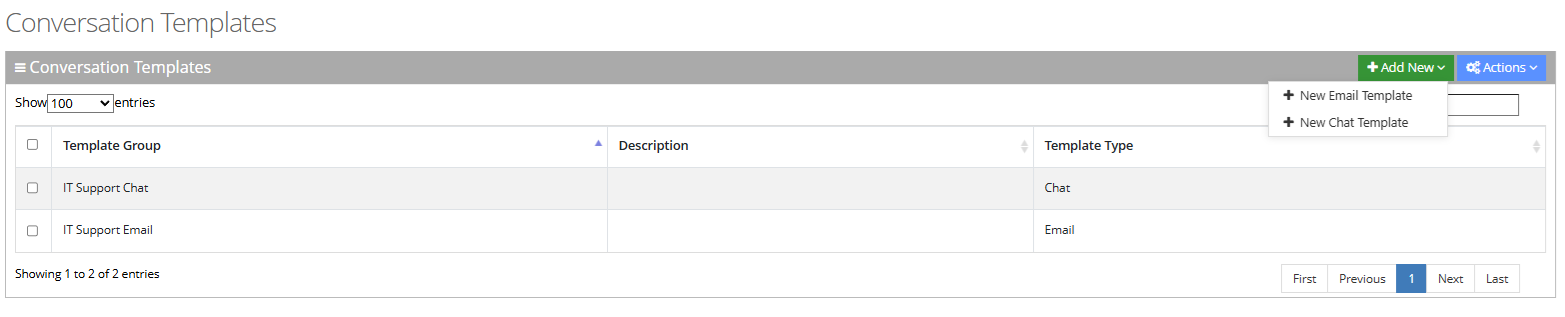 Open the Conversation Templates page (Configuration > Routing > Conversation Templates); the following appears: |