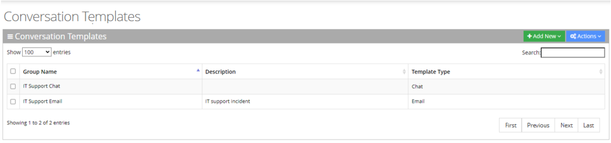 1. Open the Conversation Templates page (Configuration > Routing > Conversation Templates); the following appears: