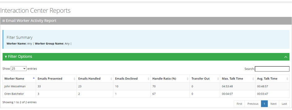 | 1. | Open the Email Worker Activity Report page (Reports > Interaction Center Reports > Email Reports > Worker Activity Report); the following appears: |