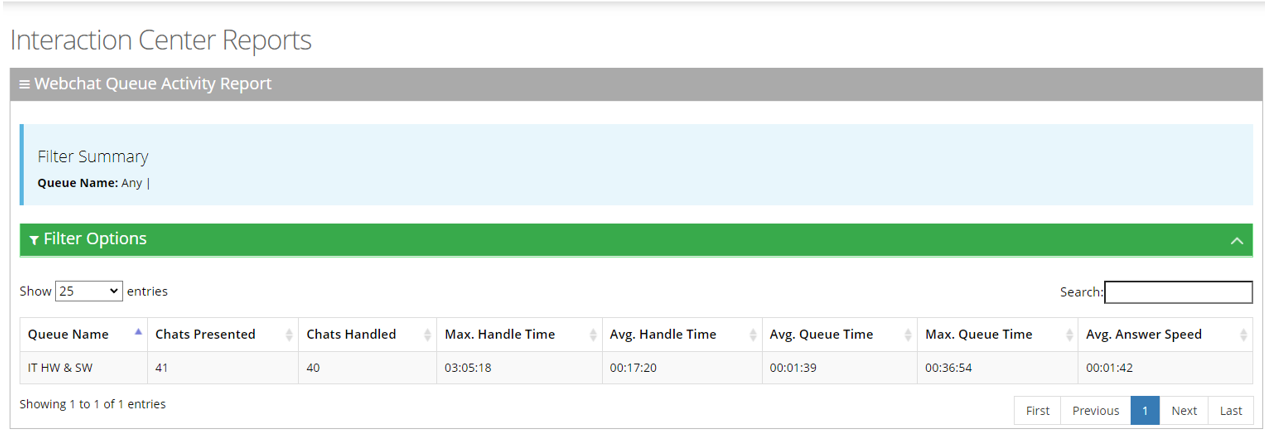 The Queue Activity Report displays summarized information of chats per queue (e.g., Presented and Handled).
