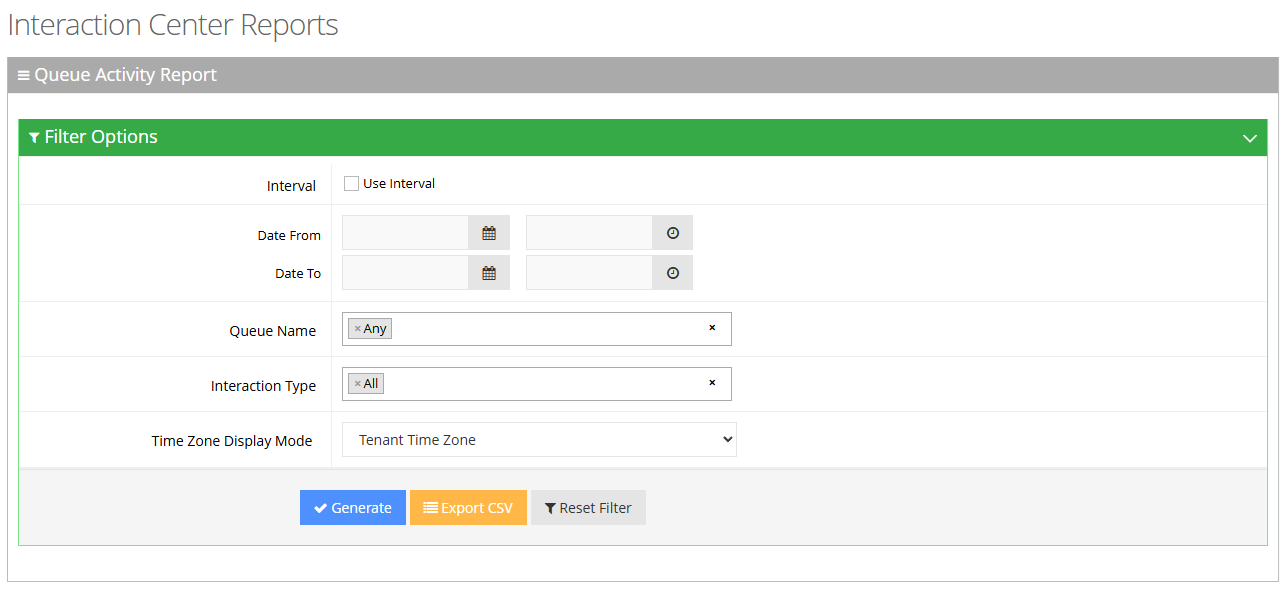 | 1. | Open the Queue Activity Report page (Reports > Interaction Center Reports > Chat Reports > Queue Activity Report); the following appears: |