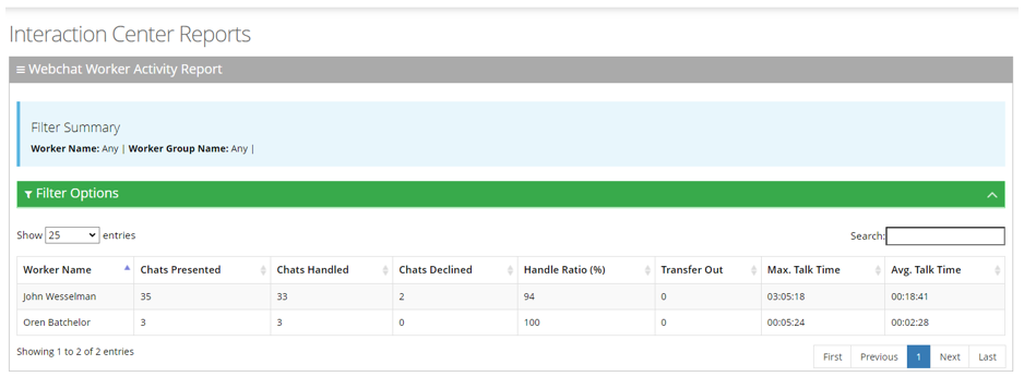 | 1. | Open the Worker Activity Report page (Reports > Interaction Center Reports > Chat Reports > Worker Activity Report); the following appears: |