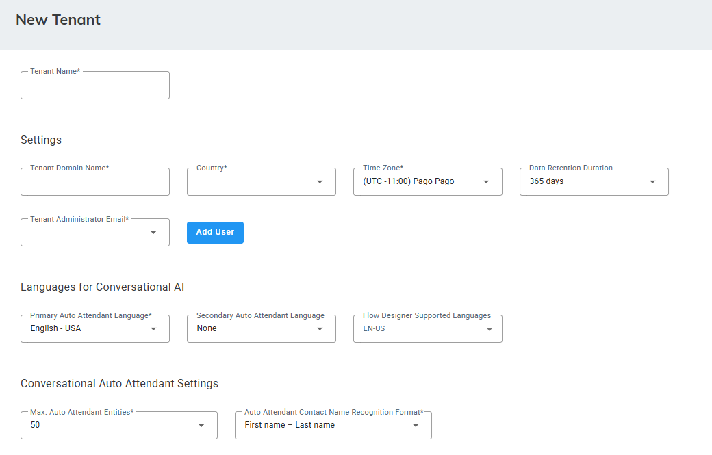 From the 'Tenant Administrator Email' drop-down list, select a user, or click Add User to add a new user. |