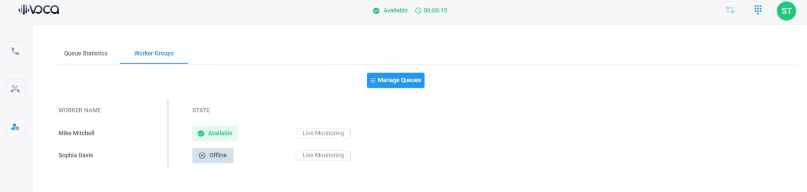 Team Management functionality enables Supervisors to oversee the Flex Members on their team. Supervisors can view the names of Flex Members listed in each queue, together with the interaction channel.