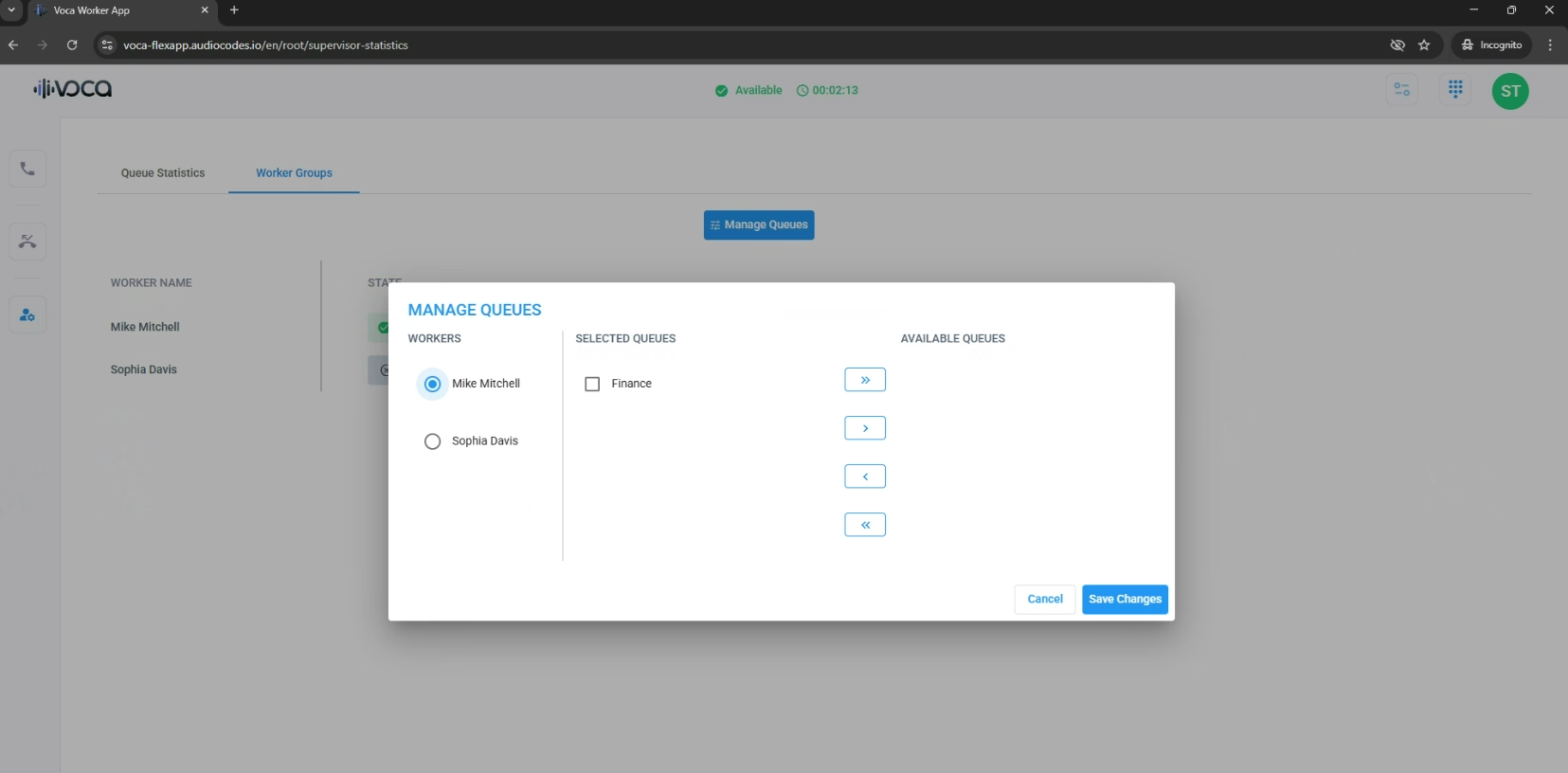 | 3. | Use the arrows to move the Flex Member between 'Selected Queues' (queues to which the Flex Member is currently associated with) and 'Available Queues' (queues that the Flex Member is not associated with, but available). |