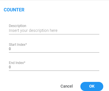 In the 'Start Index' field, enter the initial index value to be assigned when the 'Init' path is activated within the counter building block. |