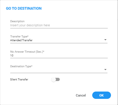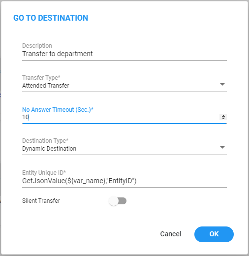 Use the 'Silent Transfer' toggle, to enable or disable the default prompt, "Transferring the call to...", before initiating the call transfer to the destination. |
