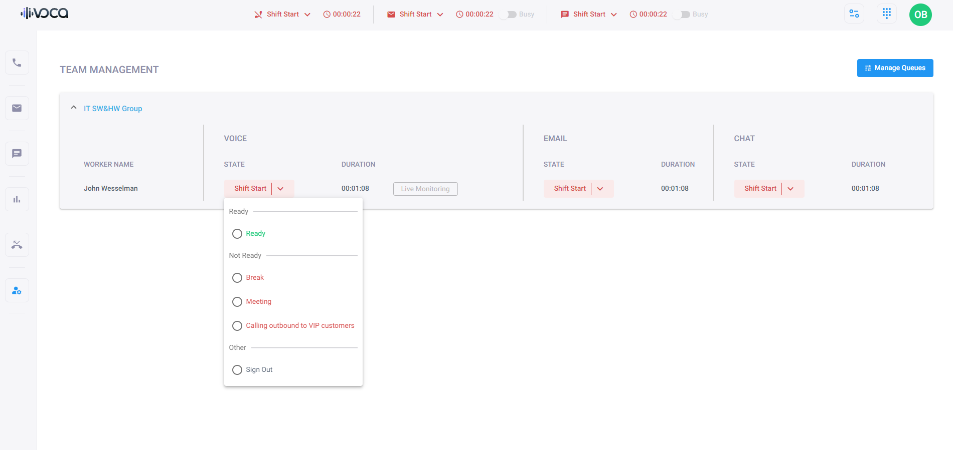 Team Management functionality enables Supervisors to oversee the Workers on their team. Supervisors can view the names of Workers listed in each queue, together with the interaction channel.