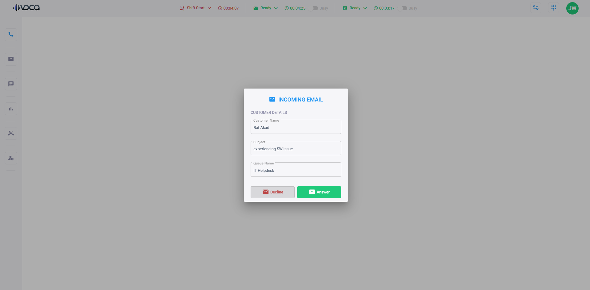 When you receive an email, a pop-up message appears displaying the queue's name, customer's name, and email subject, as shown in the following example: