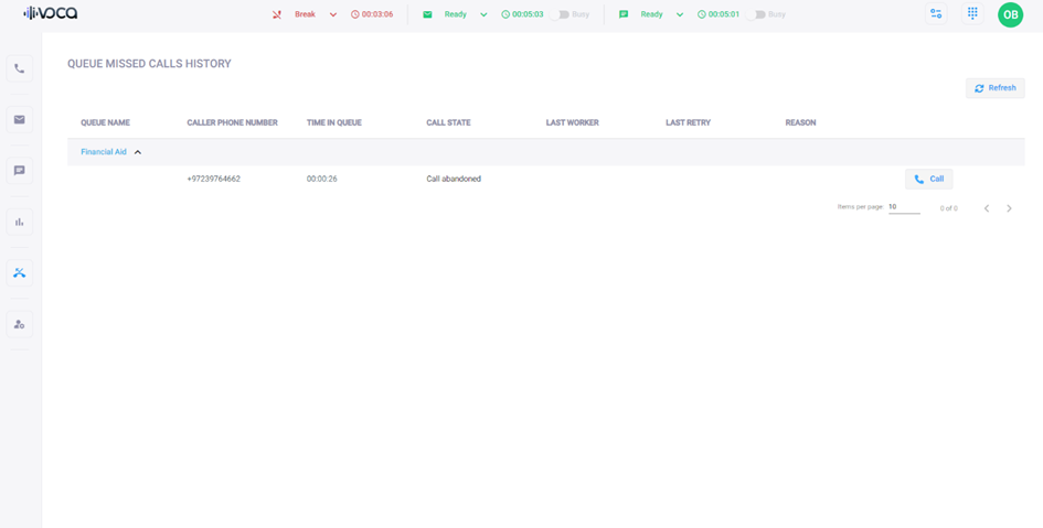 You can view all calls that were not handled, along with the reasons for the missed calls. This helps you in making outbound calls to customers who were unable to connect with you during their initial call attempt.