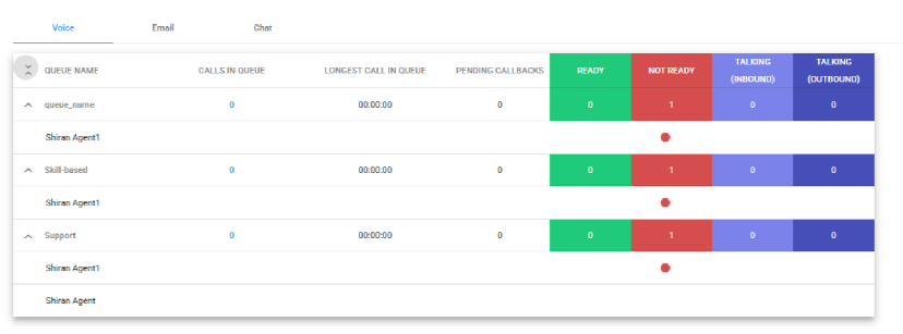 2. Select the relevant channel tab (Voice, Email, or Chat); atable displays the queue statistics for the selected channel:
