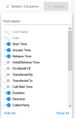 You can customize the columns that are displayed to remove clutter and optimize the page display according to analysis requirements. Displaying and hiding columns affects whether the same information is displayed below the Call Time line. In the example below, the 'Answer Time' is shown below the Time line; however, once the 'Answer Time' column is enabled, the 'Answer Time' data column is displayed, and this data is removed from the Time line display.