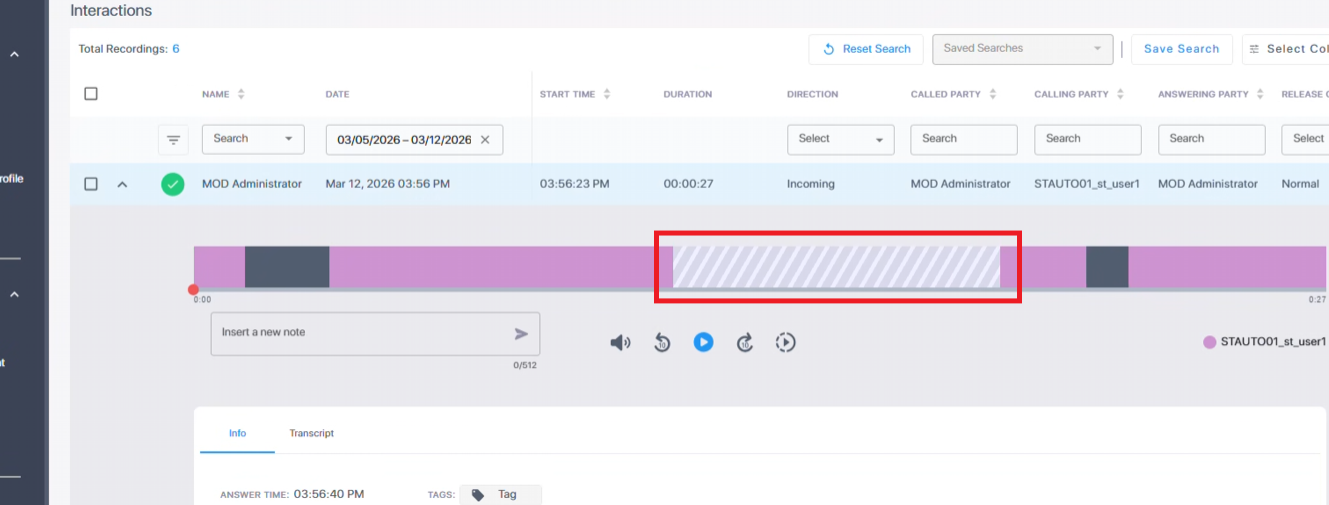 The Save option is available until the call ends, or for a period after the call, as specified in the recording profile. During that period, you can also save the recording on the Interactions page: