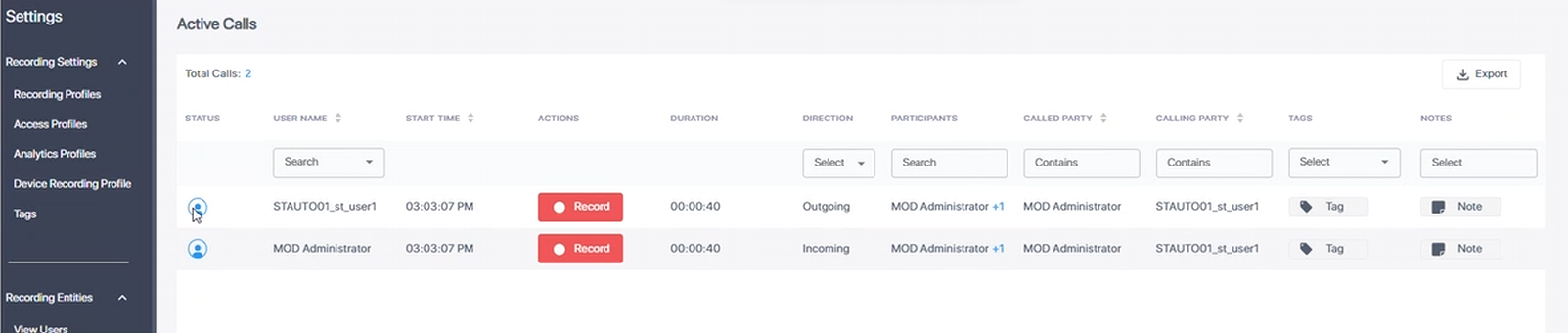 If the recording profile is set up for on-demand recording, a Record button appears for the active call in the Actions column. Click it to start recording the call.