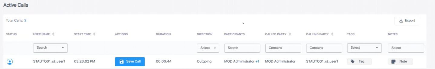 If the recording profile is set up for on-demand saving, a Save button appears for the active call in the Actions column. Click Save to permanently save the recording.